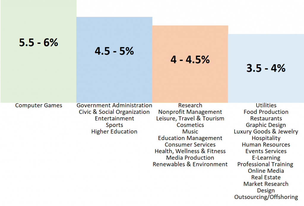 Any sector associated with learning, training or education tends to be found toward the top of our league table. For instance, there’s Higher Education (4.56%), Education Management (4.23%), e-Learning (3.67%) and Professional Training (3.63%).